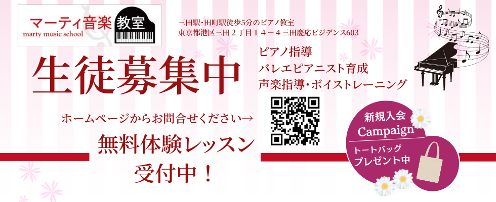 バレエ・ダンスのマーティの音楽教室、マーティ・ピアノスクールです。国際的な文化芸術体験を大切に。子供や幼児・園児の習い事、音楽教育、音感やリズム感のトレーニング、大人の趣味に最適。バレエ教室併設、バレエ・ダンスのマーティのピアノ教室です。幼児・キッズの子供スクール、初心者入門者から上級者、ソルフェージュ、 バレエピアニスト育成クラス、コンクール指導・音大受験、などクラスやコースが豊富。本格的なクラシックから、アニメ、ゲーム音楽、ポップスまで、自分の弾きたい曲で楽しくレッスン。高品質なレッスン、リーズナブルでわかりやすい料金体系、振替対応、月謝、チケット、オープンクラスなど通い方を選べます。JR田町駅、都営三田駅、赤羽橋駅からすぐ。麻布・芝・白金・高輪・芝浦地域からも通えます。発表会、季節イベント、地域イベント、発表の機会が沢山。ピアノレンタル練習、個人・プライべート指導あり。国内名門音大、海外経験・留学経験豊富な講師。幼児、幼稚園、保育園、インターナショナルスクール生も在籍。いつから始めても大丈夫。クラシック情報満載の本格的に楽しく学べるピアノ教室です。
